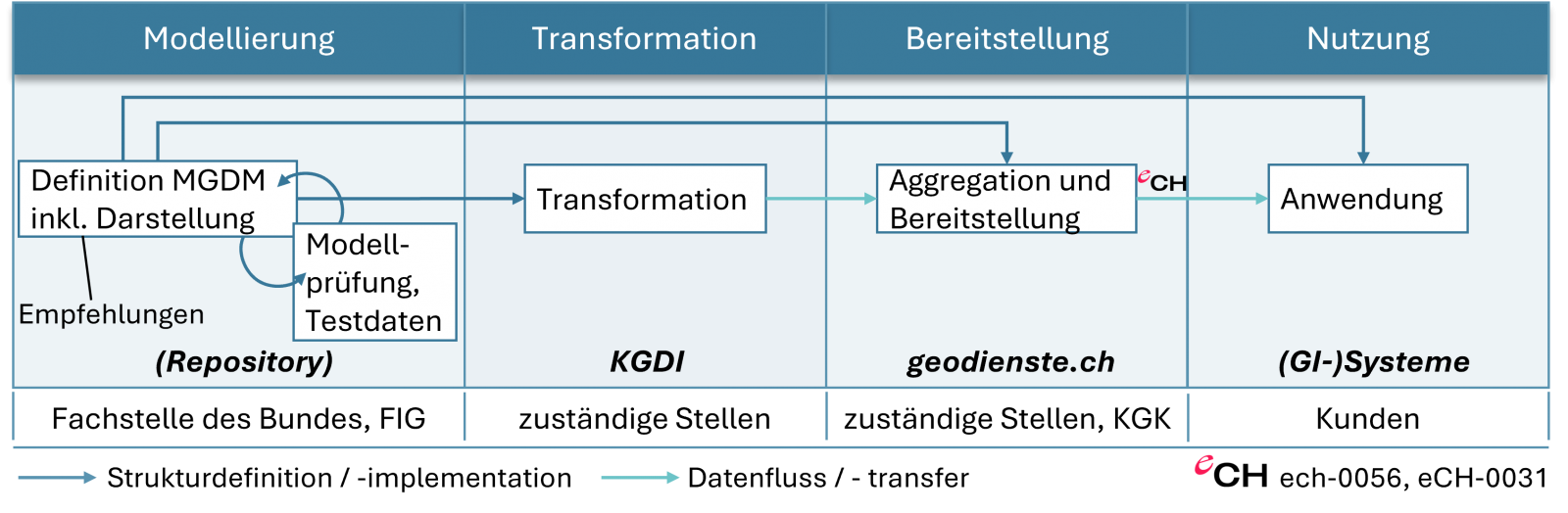 A partire dalla modellazione del MGDM, l'implementazione dei temi prioritari comprende tutte le fasi necessarie fino alla predisposizione dei corrispondenti geodati di base attraverso l'infrastruttura di aggregazione dei Cantoni.