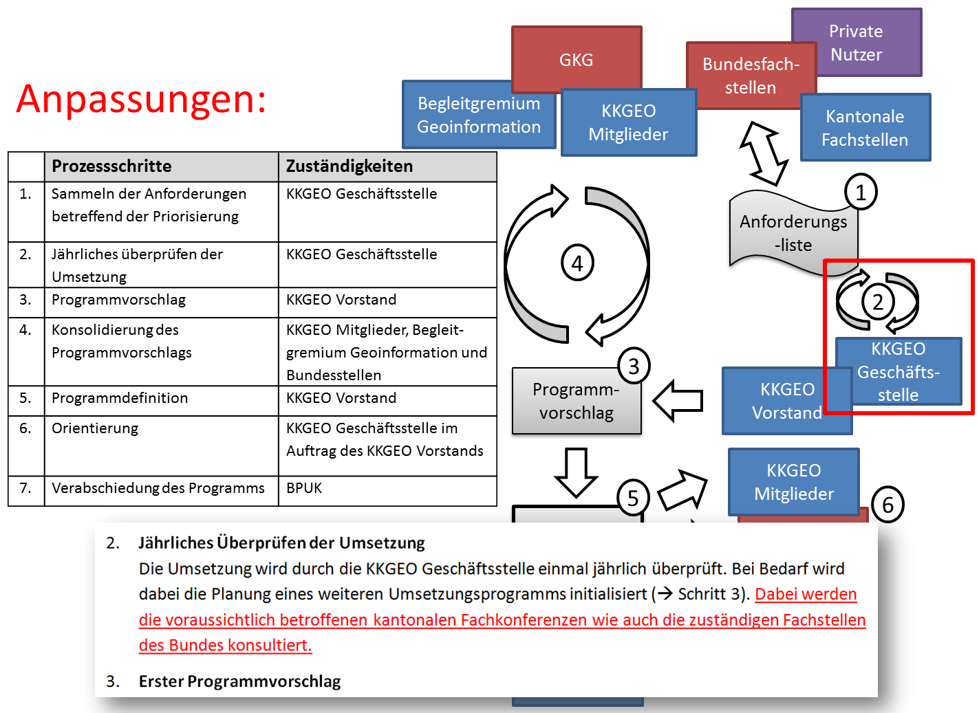 Gemäss Rückmeldungen von kantonalen Fachkonferenzen wird eine frühere Einbindung in den Prozess der Programmdefinition gewünscht. Der KKGEO Vorstand hat am 28. Juni 2019 entschieden, dass eine Einbindung der kantonalen Fachkonferenzen und der Fachstellen des Bundes vor der Definition des Programmvorschlags durch den KKGEO-Vorstand sinnvoll ist. Entsprechend wurde das Dokument der Umsetzungsplanung leicht angepasst: