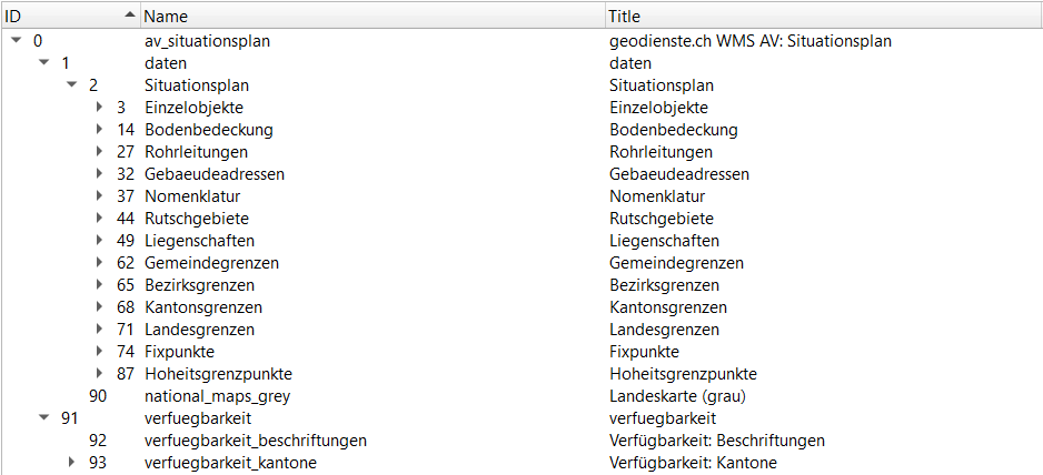 Etant donné que seules des couches ont été ajoutées dans le WMS et qu'aucune n'a été supprimée ou renommée, la fonctionnalité et le volume de données actuels sont conservés. Si vous ne souhaitez pas que les informations de disponibilité ou la "carte nationale (grise)" du plan de situation s'affichent, vous devez intégrer explicitement les couches / couches de groupe souhaitées. Le cas échéant, nous vous prions de vérifier vos WMS intégrés à partir du 10.03.2022 et d'adapter votre application si nécessaire. Ces modifications n'ont aucun effet sur tous les autres services (WFS) et formats (shp, gpkg, xtf).
